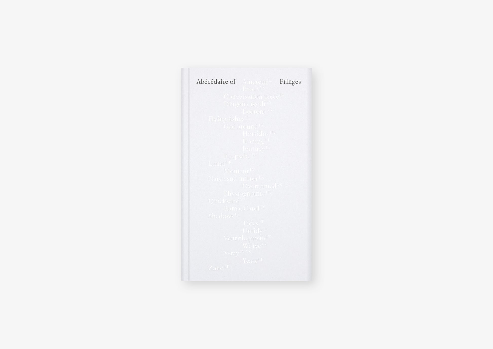 Risultato della residenza per artisti promossa dalla Fondazione Crespo, che si è svolta nella costa irlandese del West Cork, Abécédaire of Fringes raccoglie gli interventi di Lorenzo Rebediani, Vera Scaccabarozzi, Luca Trevisani e Francesca Verga. Concepito come un abbecedario, il testo intervalla riflessioni personali, annotazioni scientifiche e analisi filosofiche nate dal particolare contesto anfibio di questa regione. Privo di capitoli, Abécédaire of Fringes può essere percorso tratteggiando il proprio sentiero di lettura, rievocando in questo modo la natura frastagliata del testo stesso. Come evidenzia nell'introduzione del libro Ben Livne Weitzman, curatore della Crespo Foundation's Glenkeen: "Nell'esplorazione dei margini c'è un senso di urgenza, poiché questi spazi sfaccettati e intrinsecamente non-binari sono sistematicamente trascurati ed esclusi dalle narrazioni e dalle strutture dominanti. [...] Il paesaggio stesso si trasforma in un narratore, invitando alla riflessione e alla rivelazione interiore, accanto a una linea costiera in continua evoluzione".