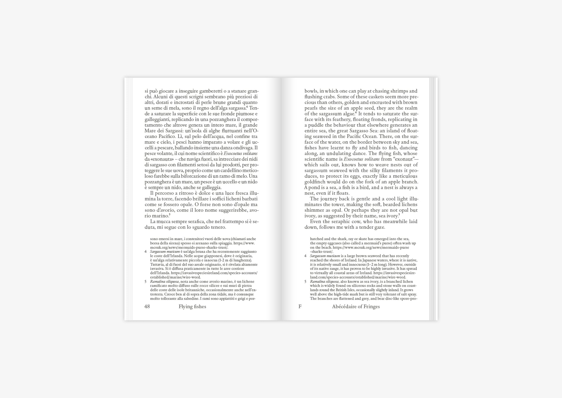 The outcome of the artist residency promoted by Fondazione Crespo, which took place on the Irish coast of West Cork, "Abécédaire of Fringes" collects the contributions of Lorenzo Rebediani, Vera Scaccabarozzi, Luca Trevisani, and Francesca Verga. Conceived as an abecedary, the text combines personal reflections, scientific annotations, and philosophical analyses arising from the unique amphibious context of this region. Devoid of chapters, "Abécédaire of Fringes" can be navigated by tracing a path through it, echoing the jagged nature of the text itself. As Ben Livne Weitzman, curator of the Crespo Foundation's Glenkeen, points out in the book's introduction: "There is a sense of urgency in exploring the margins, as these multifaceted and inherently non-binary spaces are systematically overlooked and excluded from dominant narratives and structures. [...] It transforms the landscape itself into a narrator, inviting reflection and revelation within and alongside the ever-shifting coastline".