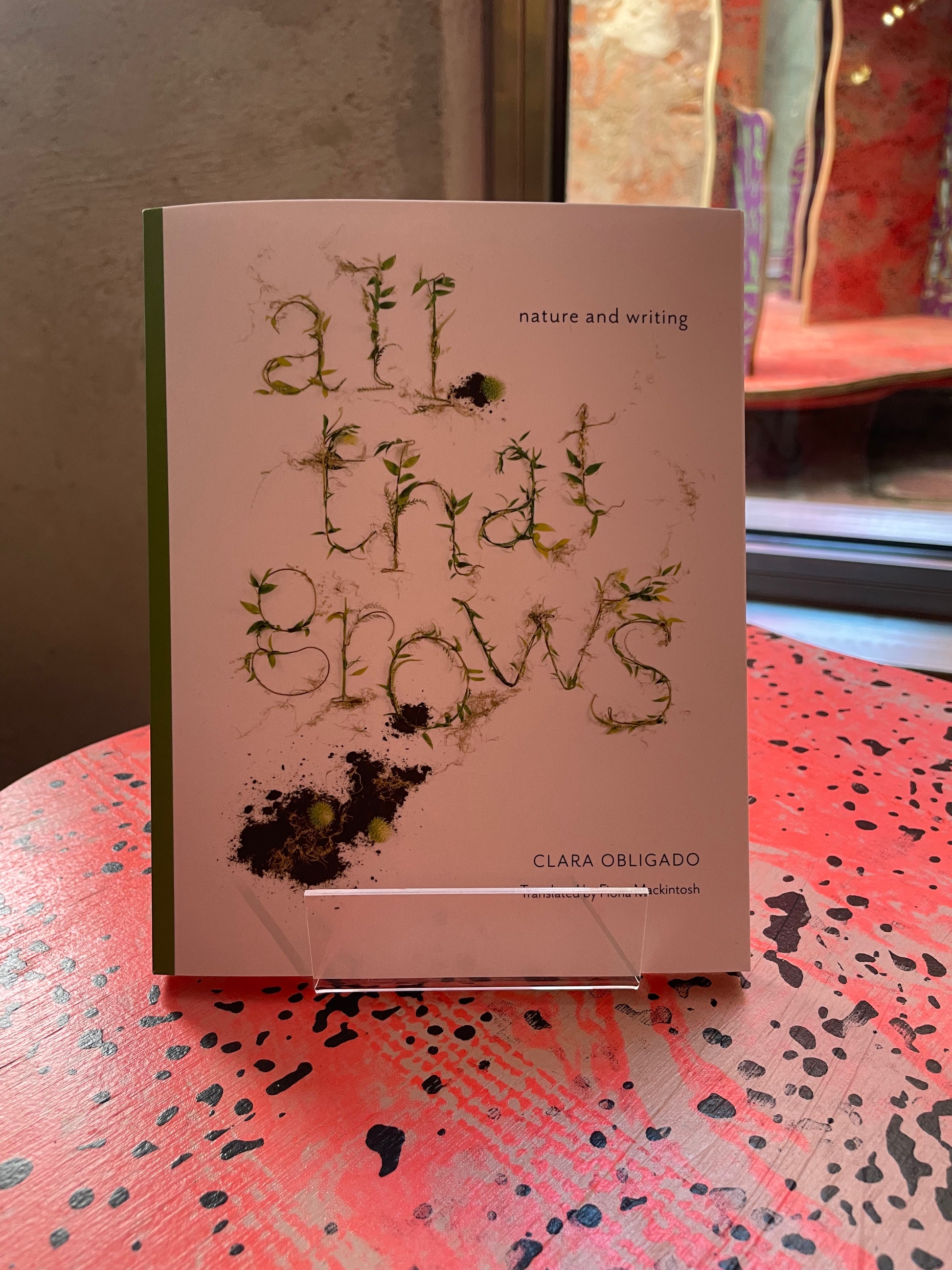 all that grows: nature and writing is the English-language translation of Todo lo que crece: naturaleza y escritura by the Argentinian author Clara Obligado. The book chronicles the author's upbringing in Argentina, her exile to Spain, and her resulting reconciliation of place, memory, loss, and growth. Through botanical and natural metaphors as well as frank recollection of events, the book explores the passage of time across different hemispheres and dialects. As the author navigates shifts in landscape and language, her writing becomes a shelter and a form of time travel, mirroring the natural world’s ability to invent and reinvent itself.