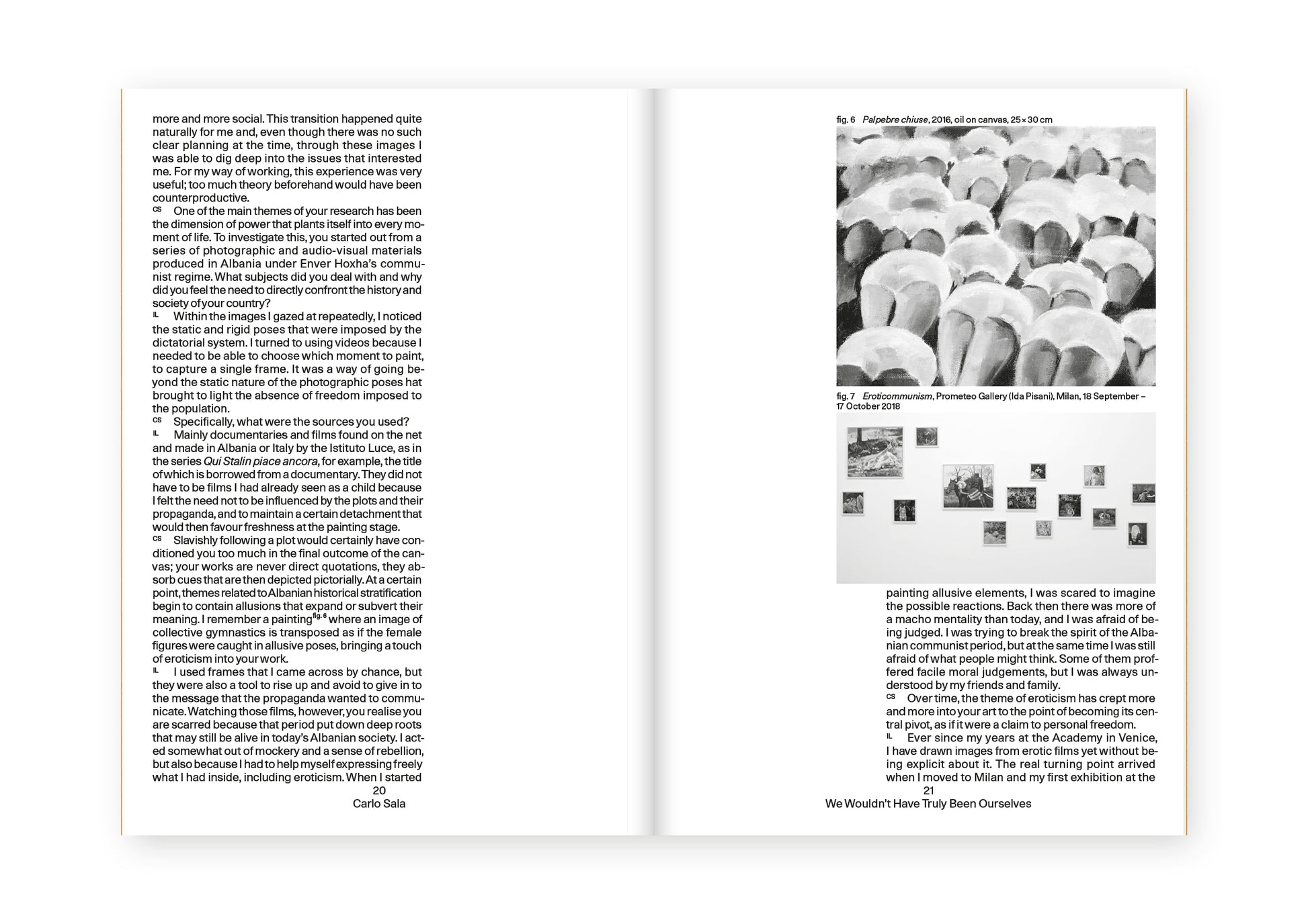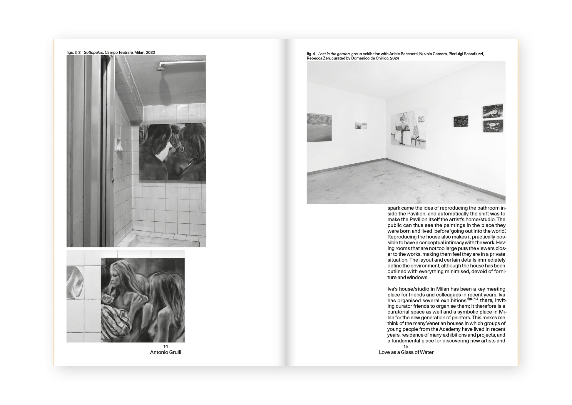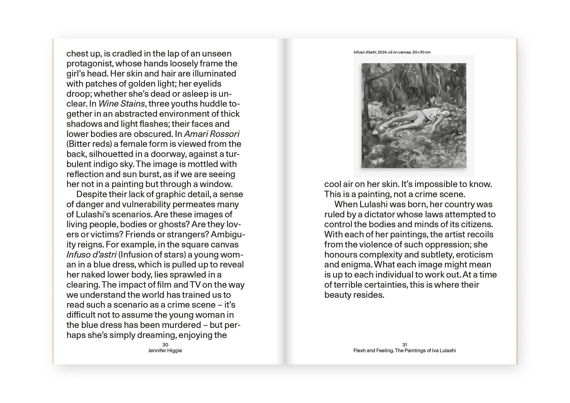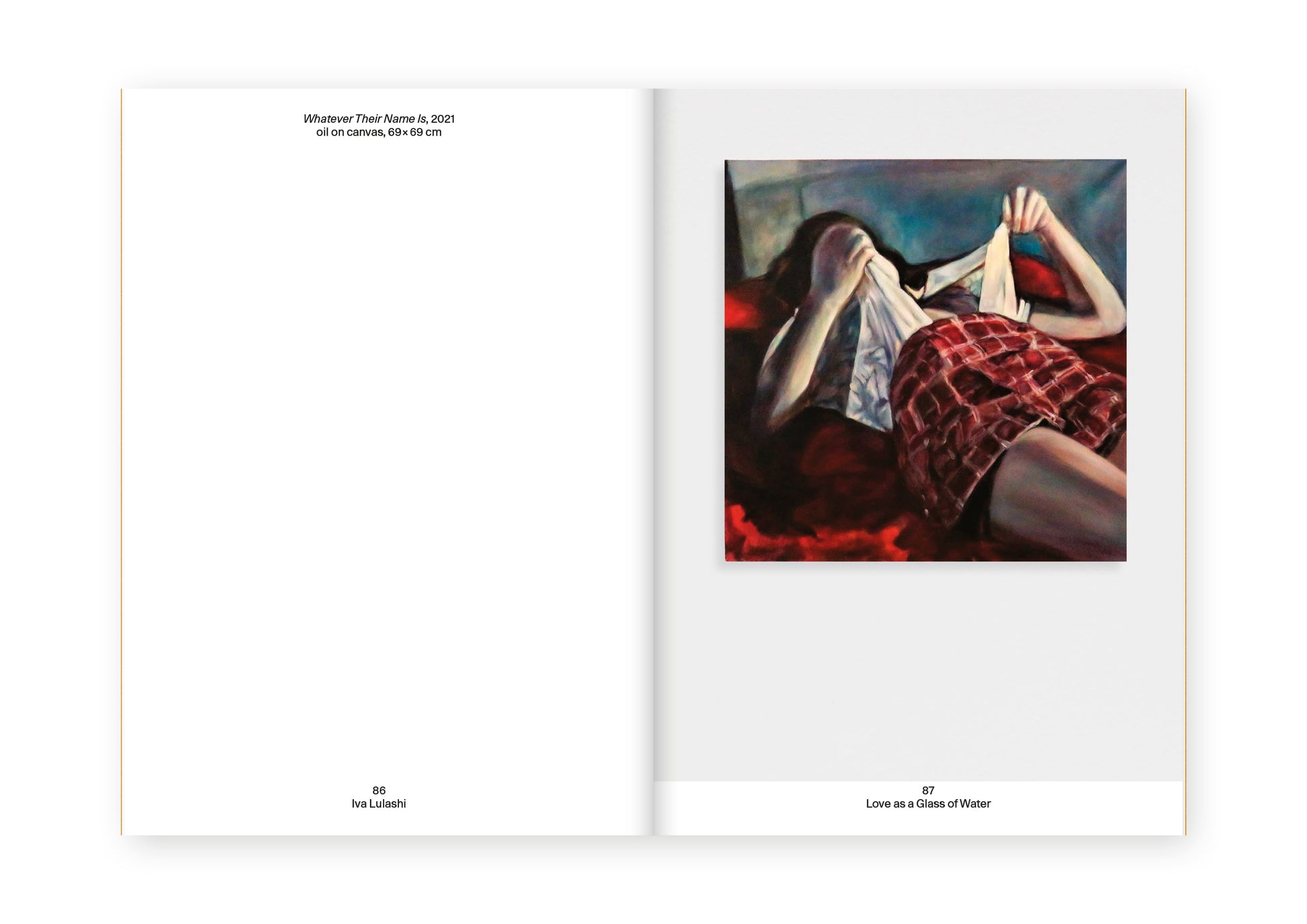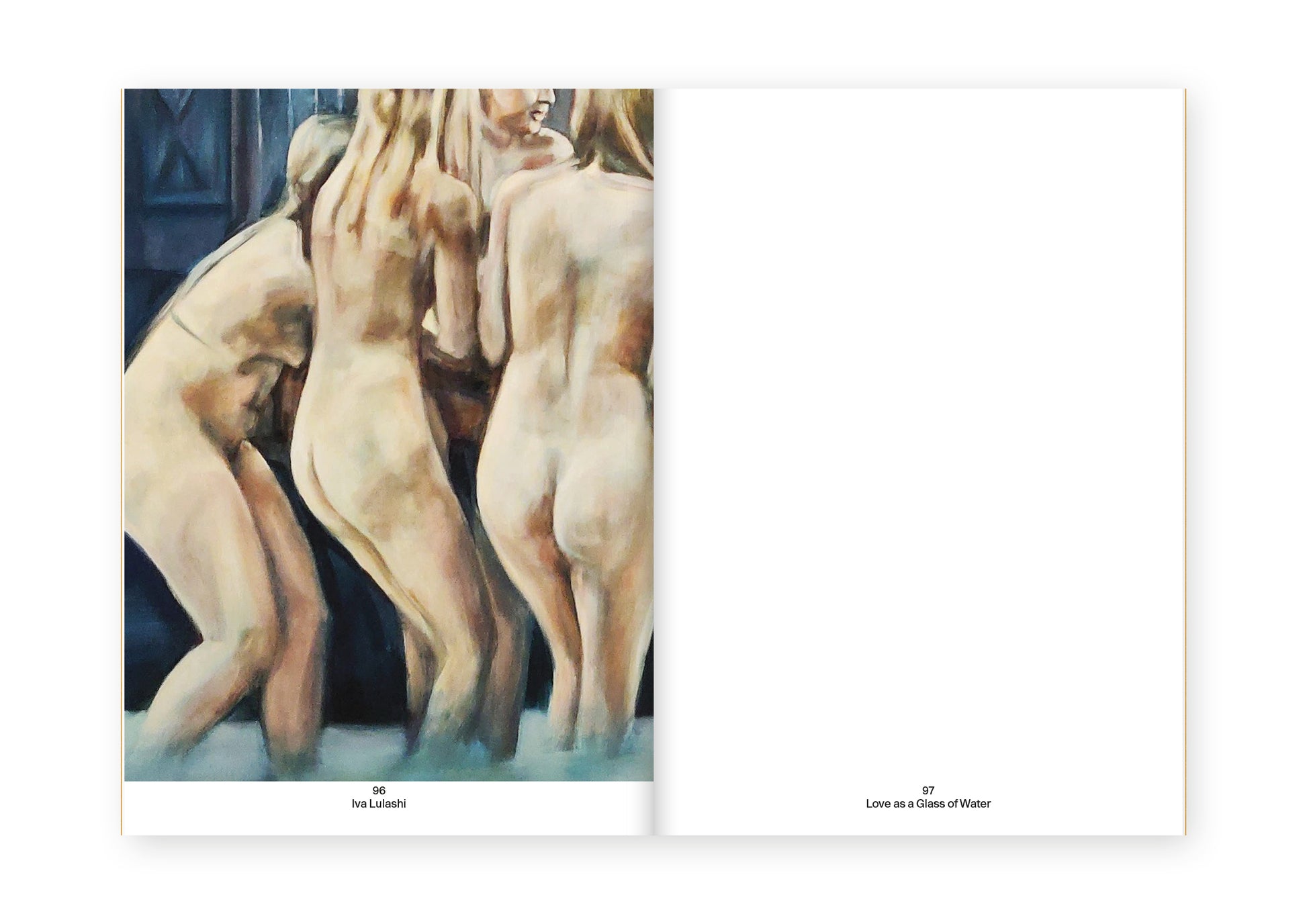 Iva Lulashi. Love as a Glass of Water is the catalogue for the homonymous exhibition at the Albanian Pavilion of the Venice Biennale 2024, Stranieri ovunque – Strangers Everywhere. The “Theory of the Glass of Water”, linked to radical thinker and feminist Alexandra Kollontai (St. Petersburg, 1872 – Moscow, 1952), calls for a sexual and emotional revolution in which impulses are seen as simple human needs, to be satisfied with the ease and carefreeness with which a glass of water is usually drunk. Love, desire, impulse and sexuality are the essence of Iva Lulashi’s work, transcending boundaries and uniting multiple perspectives. Inspired by the erotic media, Lulashi captures stills from films and videos, igniting the creative process for her artworks, which predominantly feature female figures. These works subtly suggest scenarios of potential eroticism, evoking emotions of strength, fear, hope and a longing for freedom. They serve as a tribute to female desire, reflecting unresolved pasts intertwined with global political issues that are encountered on a daily basis.