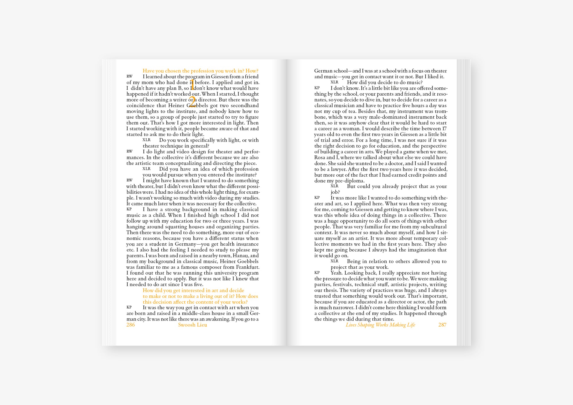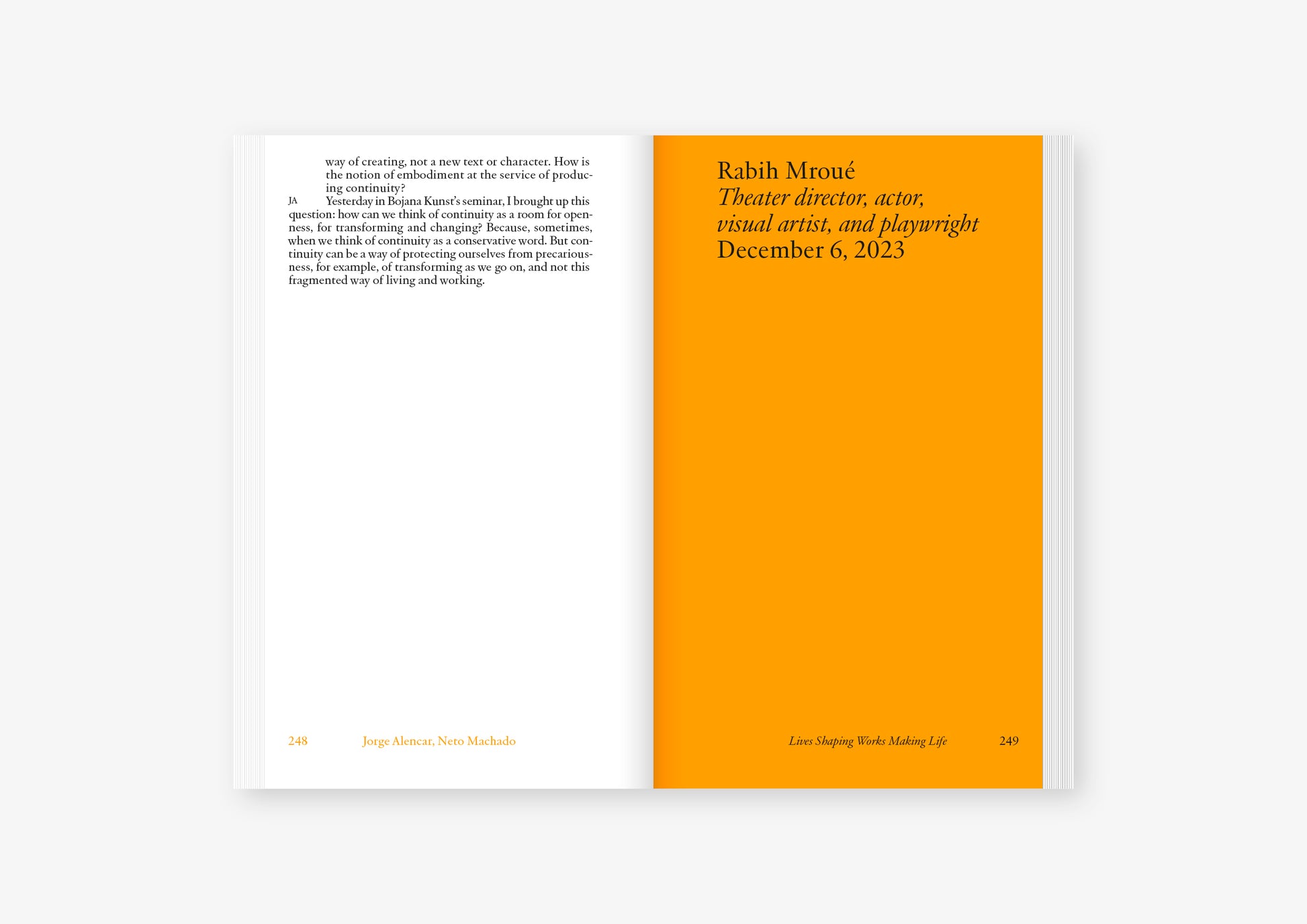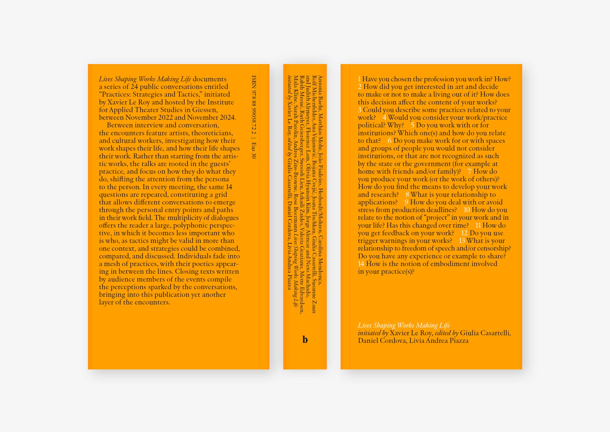 Lives Shaping Works Making Life is a collection of 24 transcribed public conversations titled Practices: Strategies and Tactics, led by Xavier Le Roy and hosted by the Institute for Applied Theater Studies in Giessen between November 2022 and November 2024. These dialogues bring together artists, cultural workers, and curators, creating a space where Xavier Le Roy engages in conversation with each guest.