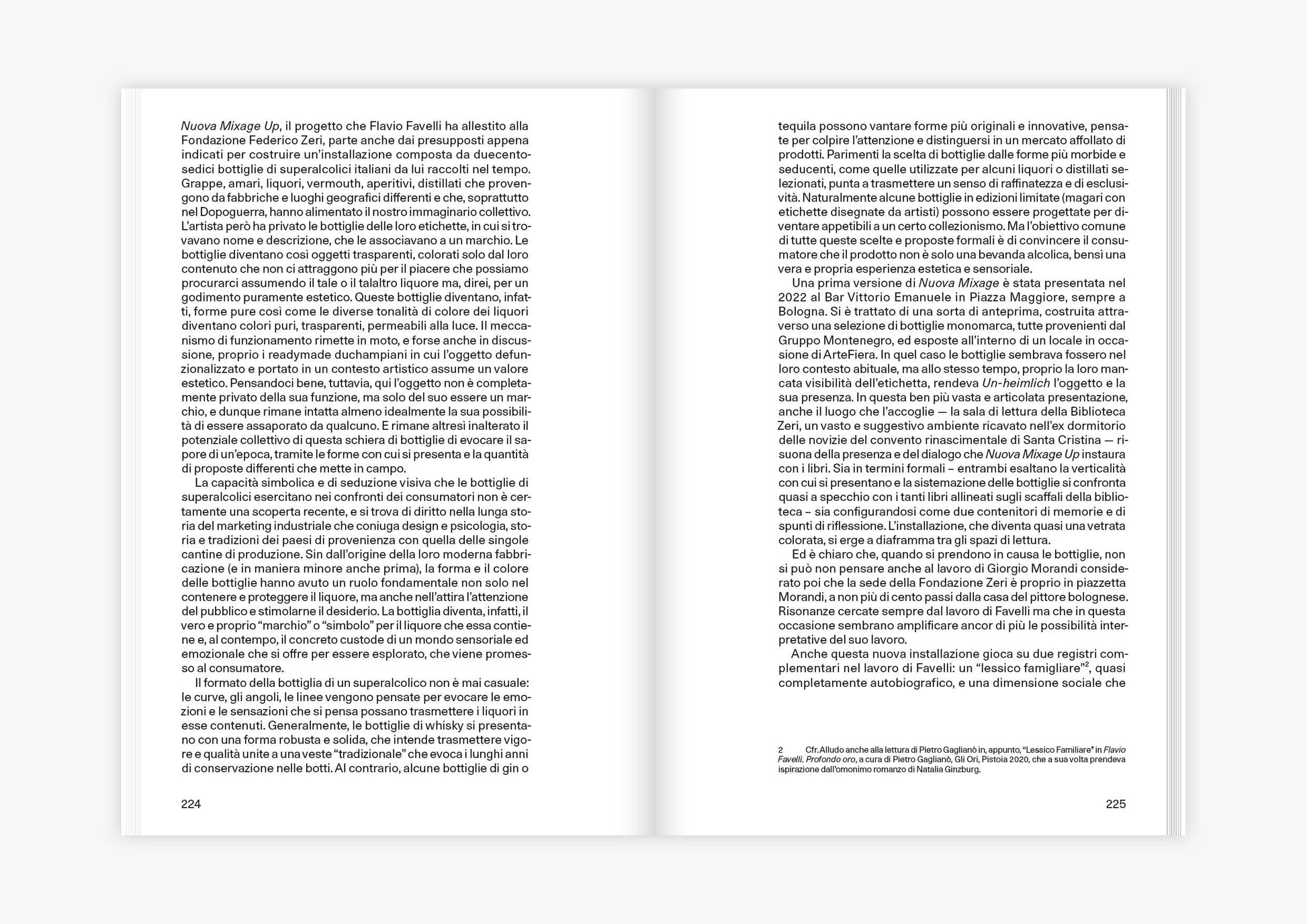 Pagina dopo pagina Nuova Mixage alterna le bottiglie di superalcolici italiani che sono state collezionate e private di etichette da Flavio Favelli. Il libro nasce a partire dell’installazione Nuova Mixage Up presentata dalla Fondazione Federico Zeri il 16 gennaio 2025 all’interno della sala di lettura della Biblioteca Zeri di Bologna. Le duecentosedici bottiglie che compongono l’istallazione sono poste sulle mensole di una libreria dialogando con la collezione di libri che la circondano. Seguendo una logica cromatica le bottiglie di Nuova Mixage occupano l’intera pagina, scomponendo visivamente l’istallazione e permettendo così di osservare i fini dettagli di ogni singolo oggetto. Il libro è accompagnato da un testo di Flavio Favelli e da un saggio critico di Roberto Pinto.