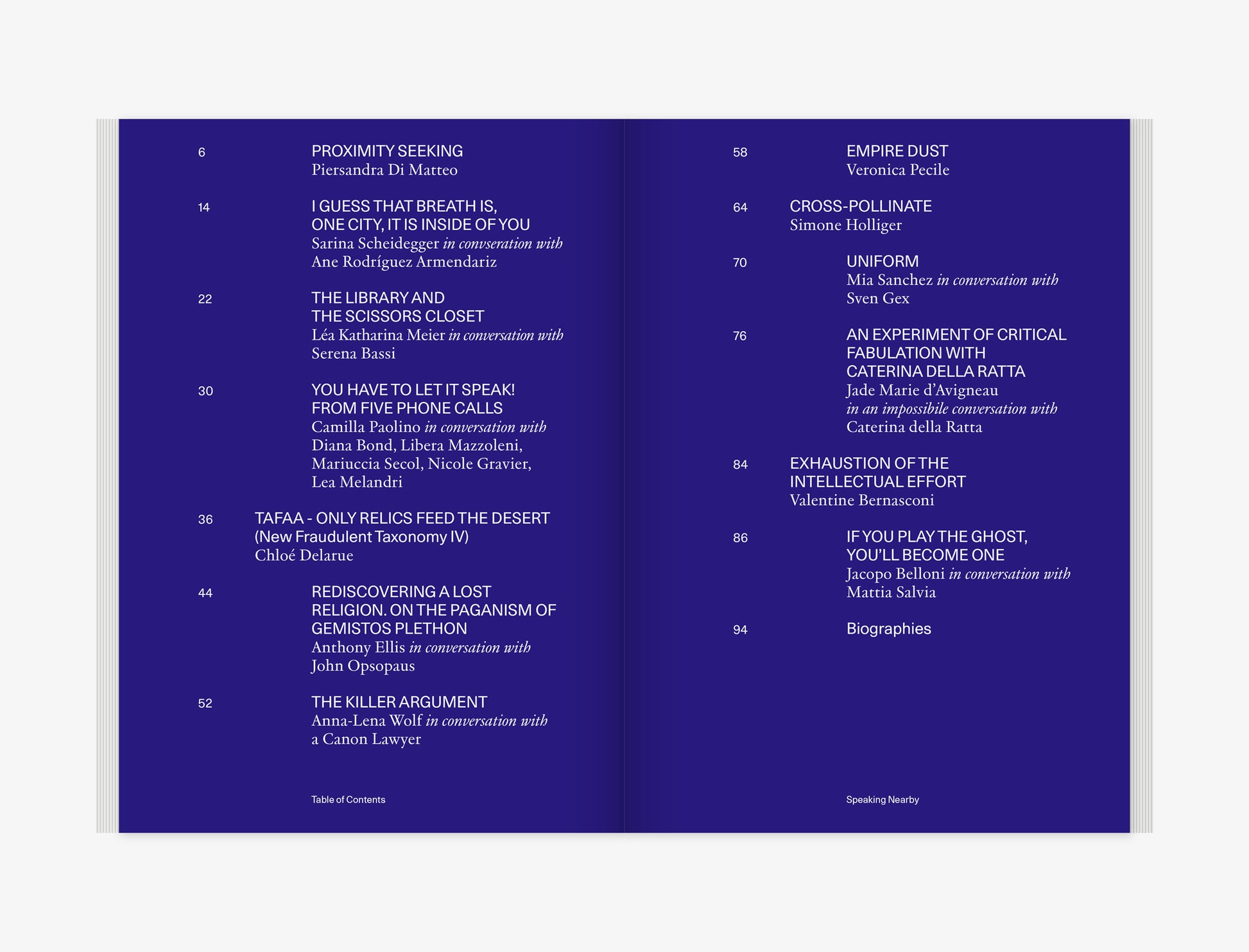 Contributions by: Jacopo Belloni, Valentine Bernasconi, Chloé Delarue, Anthony Ellis, Simone Holliger, Jade Marie d’Avigneau, Léa Katharina Meier, Camilla Paolino, Veronica Pecile, Mia Sanchez, Sarina Scheidegger, Anna-Lena Wolf