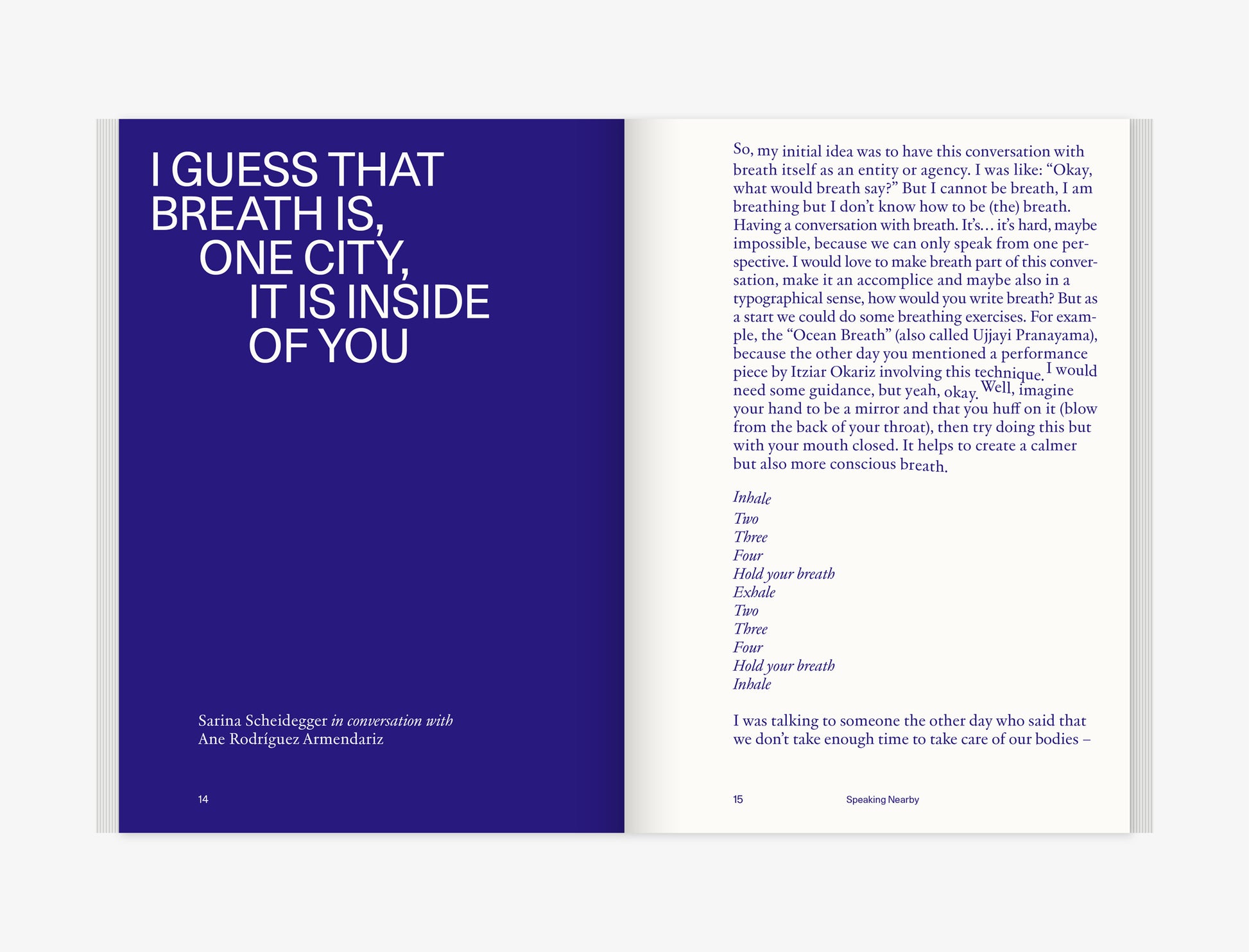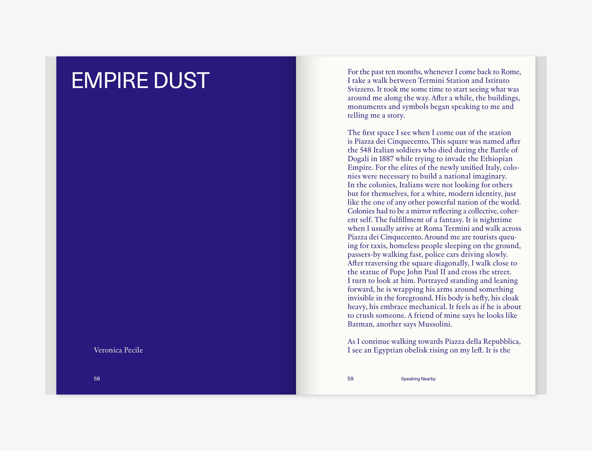 Speaking Nearby blends theoretical orientations and artistic gestures that embody various degrees of intimacy, sympathy, and permeability. The researchers and artists in the 10-month residency at Istituto Svizzero, within the framework of Roma Calling 2023/2024, present punctual emergences of their research, revealing the intra-action between bodies and matter through different protocols of encounters, the attunement to certain environments, and the transformations resonating within situated processes.